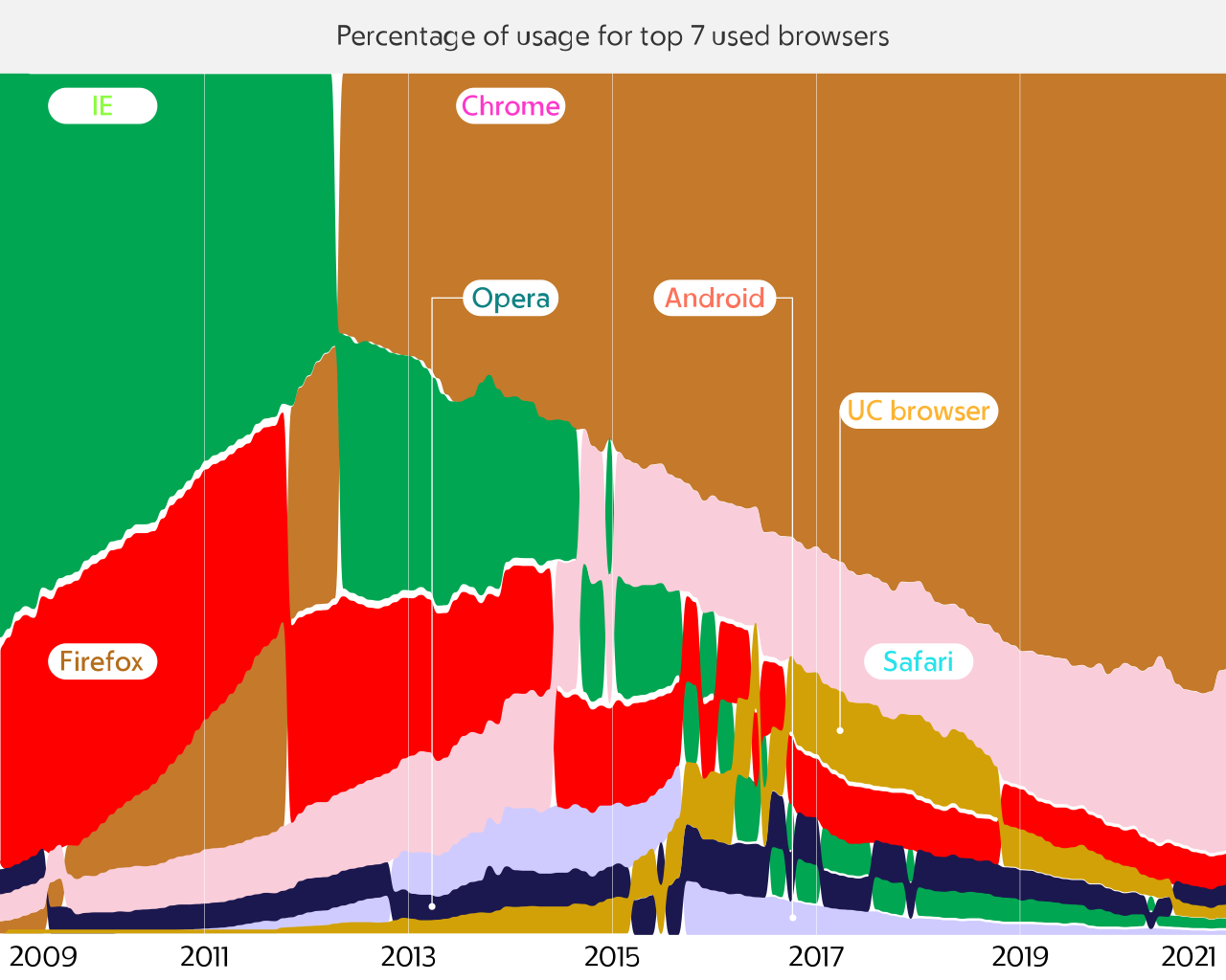 È l’epoca del “don’t be evil”, di Gmail su invito, Google rappresenta il gigante buono della nuova epoca dell’Internet. Le cose da allora sono cambiate, e parecchio, sta di fatto che, anche grazie al successo dei dispositivi Android, ad oggi Chrome rappresenta il dominatore incontrastato della seconda guerra dei browser: a parte Safari e l’ecosistema Apple/IOS, il resto è decisamente residuale.